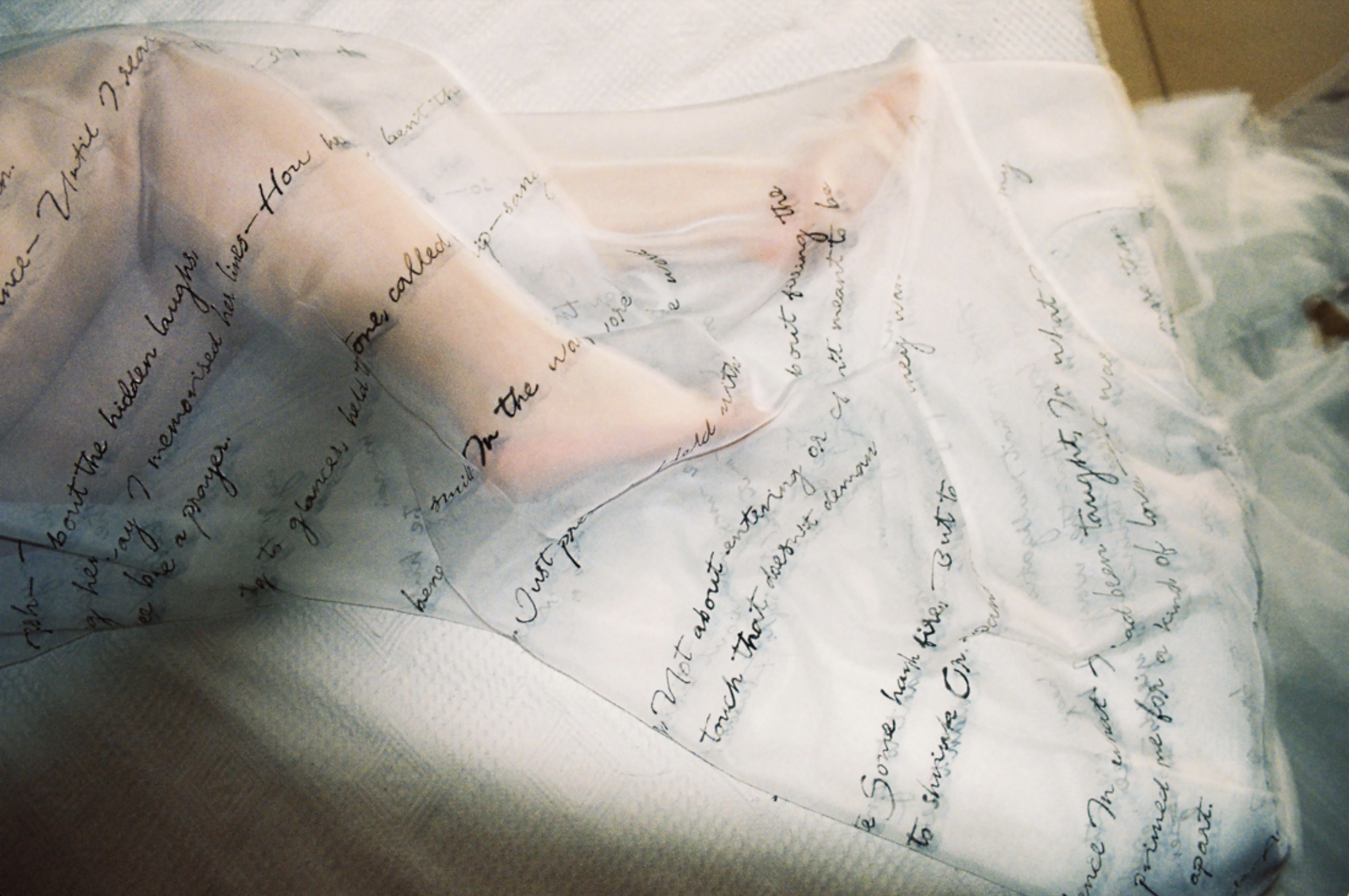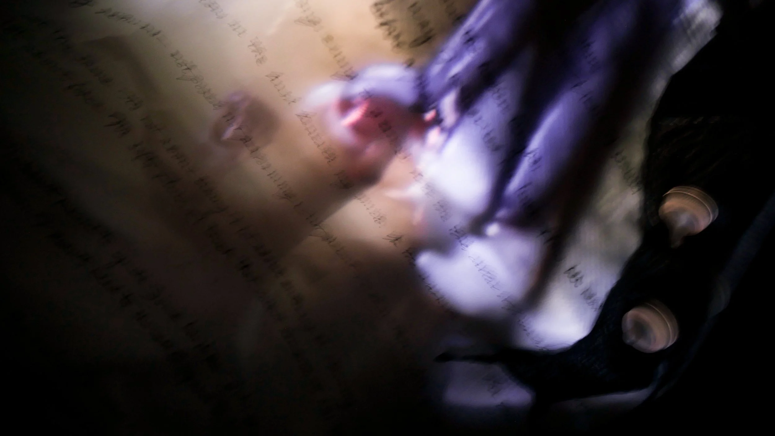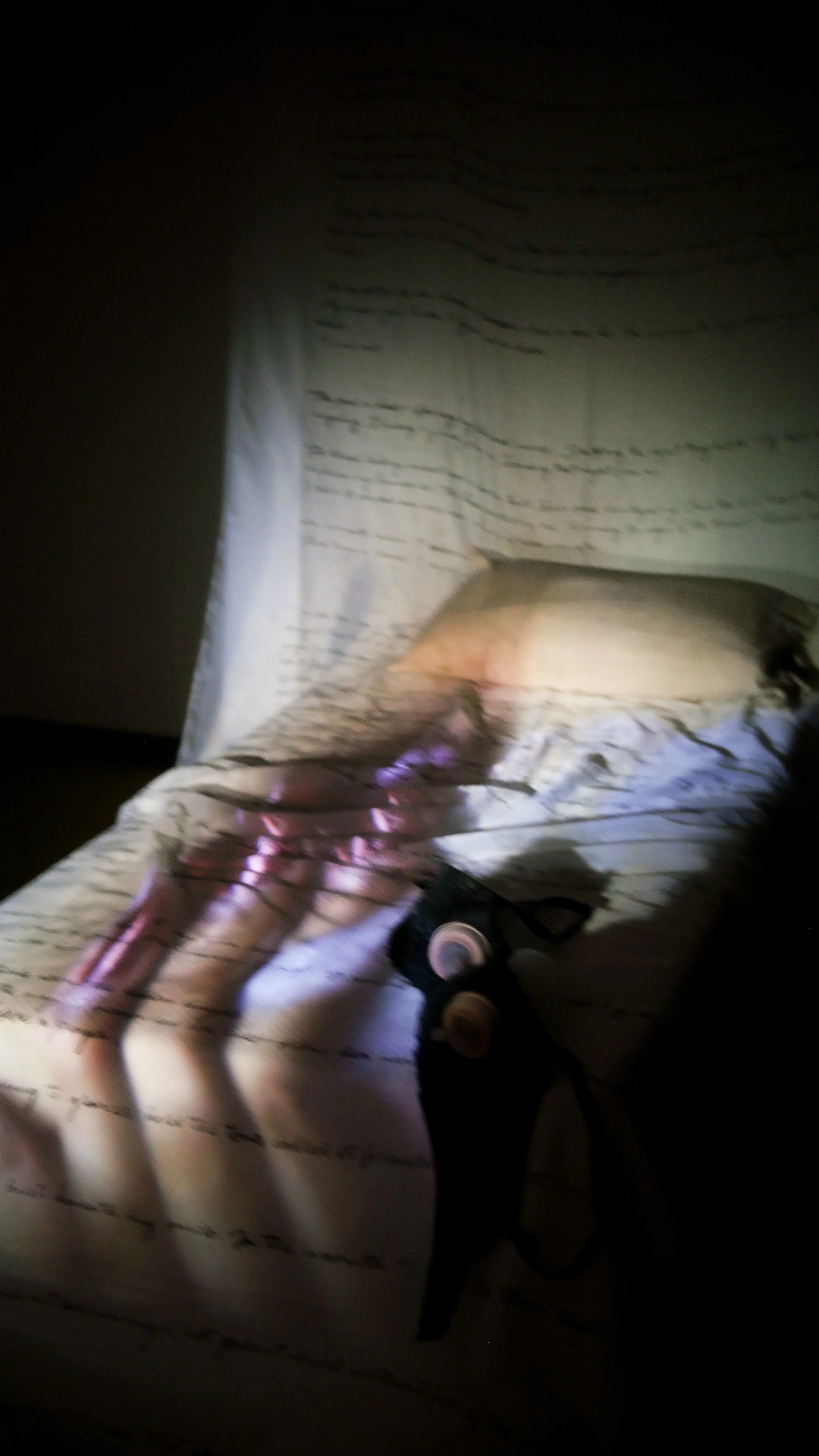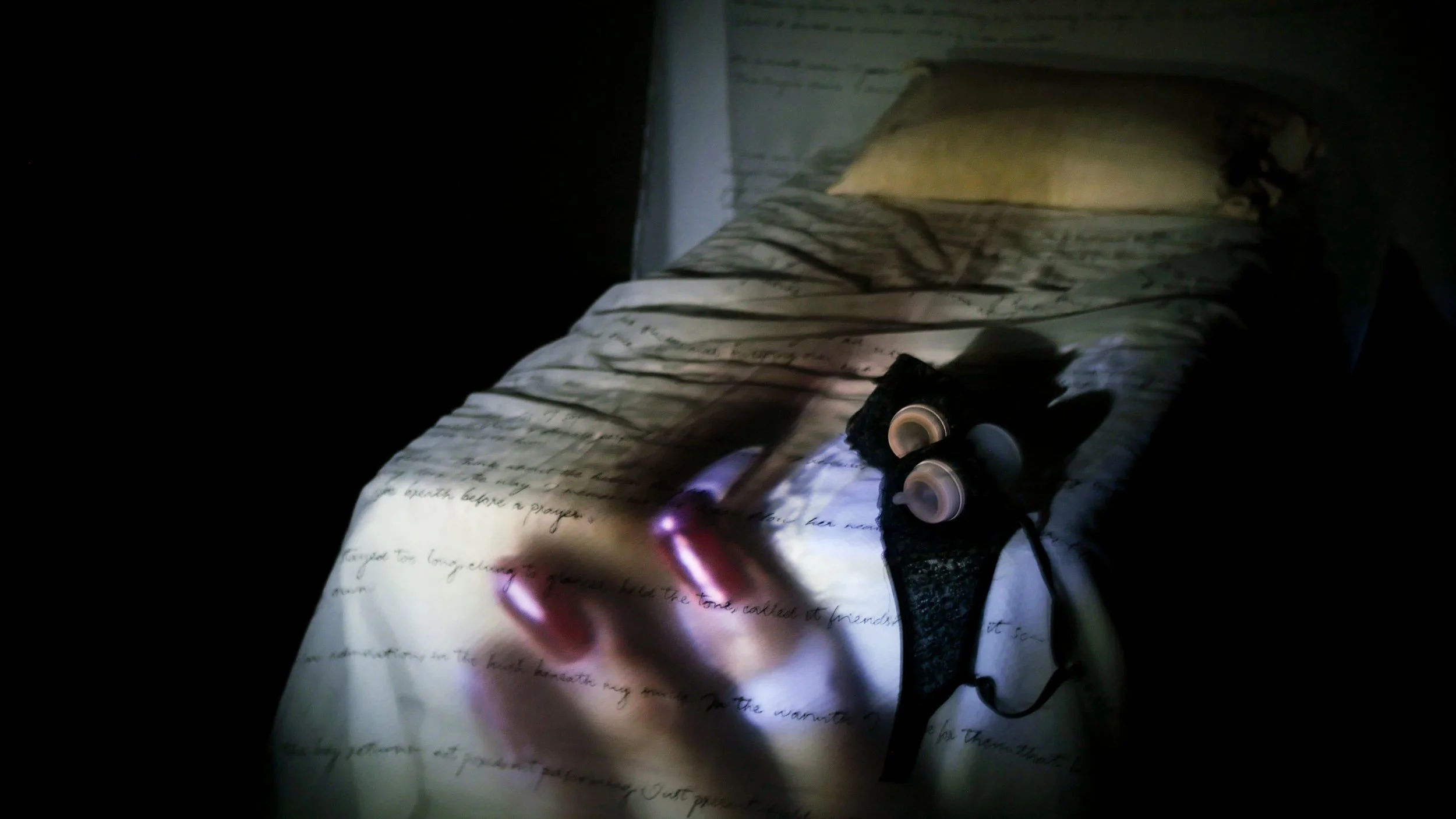 Voice, writing, ink on fabric, lace bra, baby bottles, speaker, light, bed, pillow, film projection (2025)
